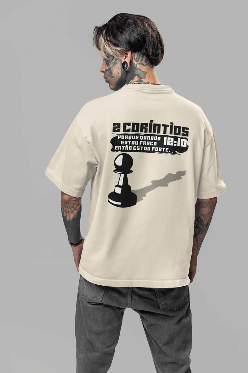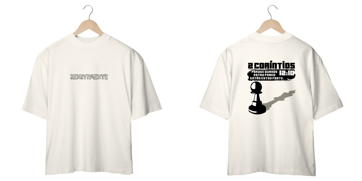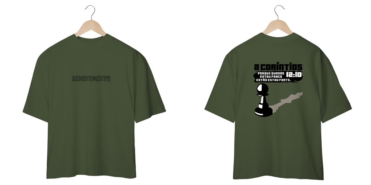 Estou Forte, modelagem mais ampla e larga do que as camisetas convencionais, proporcionando um caimento relaxado e confortável.