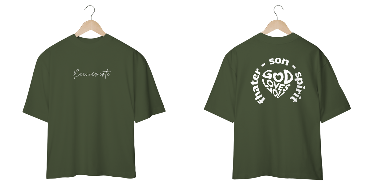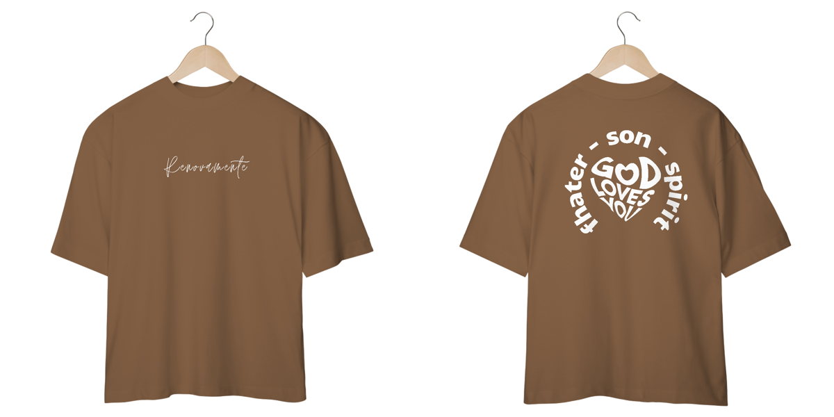 Deus ama você, modelagem mais ampla e larga do que as camisetas convencionais, proporcionando um caimento relaxado e confortável.