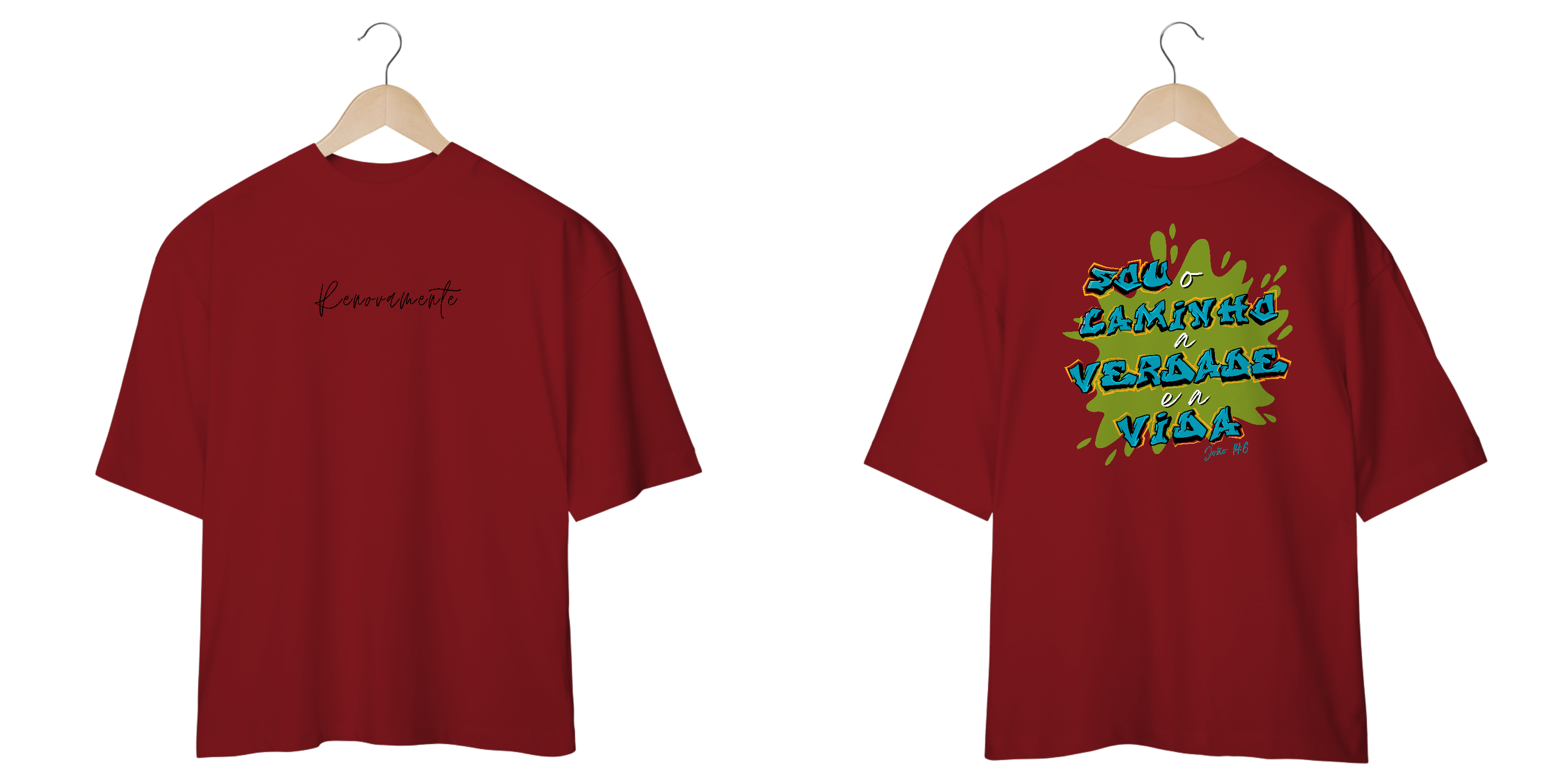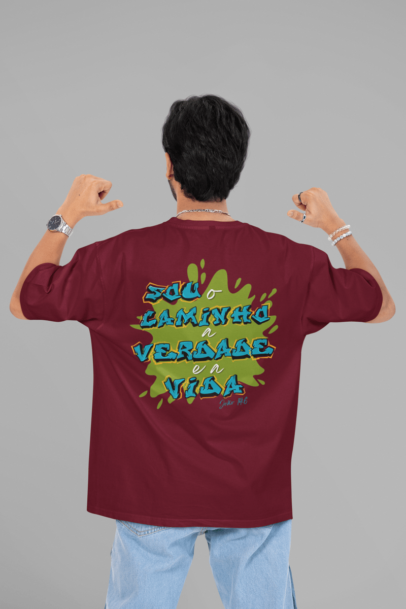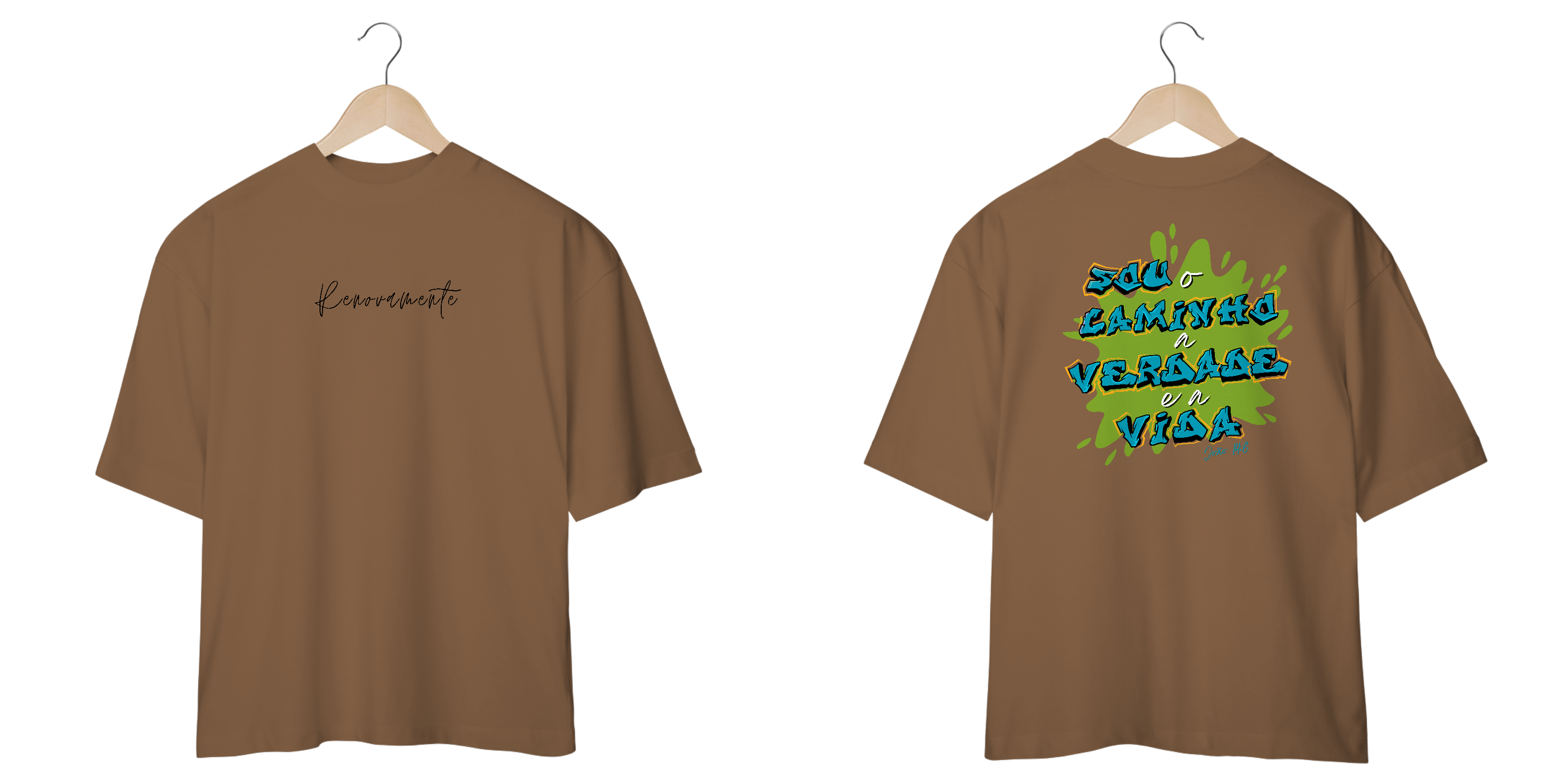 Jesus único caminho, modelagem mais ampla e larga do que as camisetas convencionais, proporcionando um caimento relaxado e confortável.
