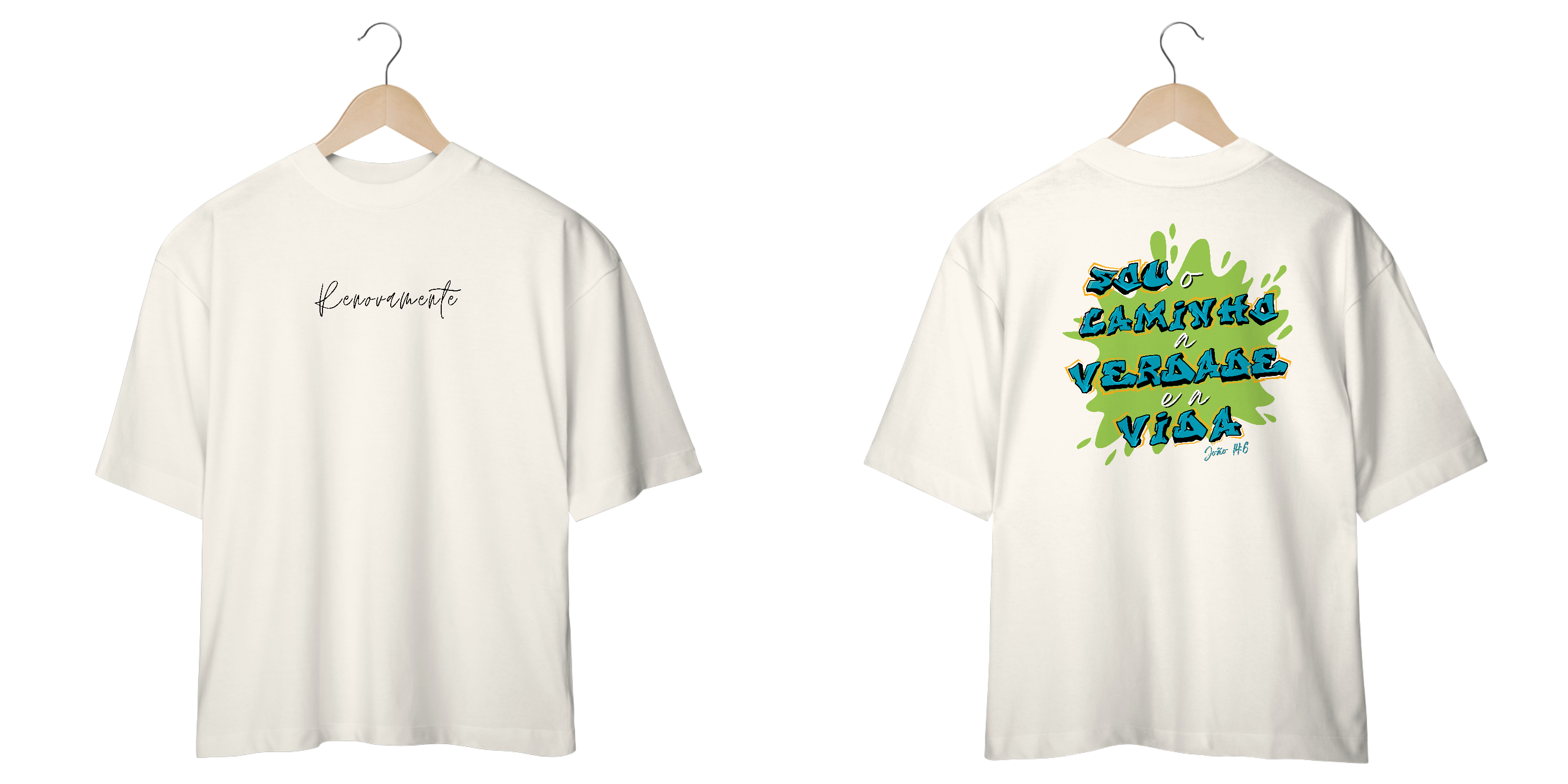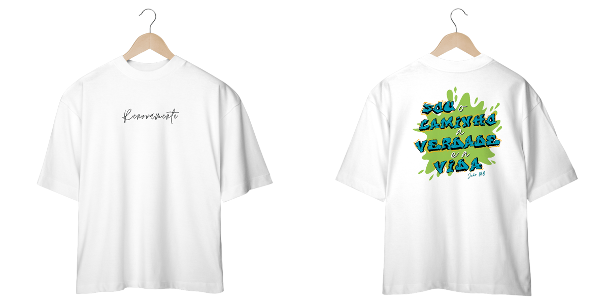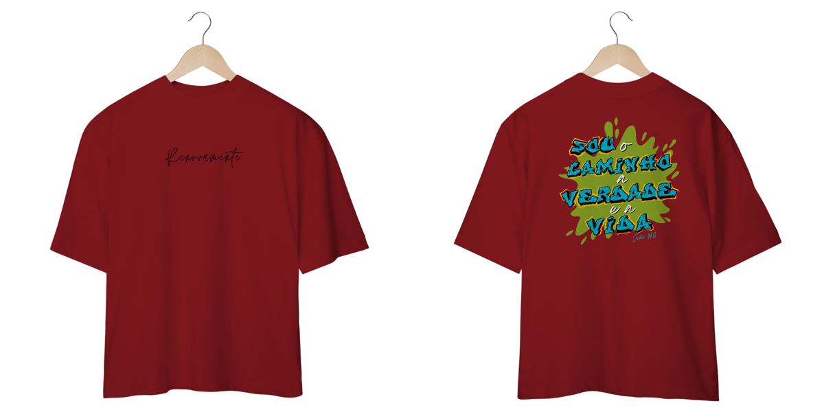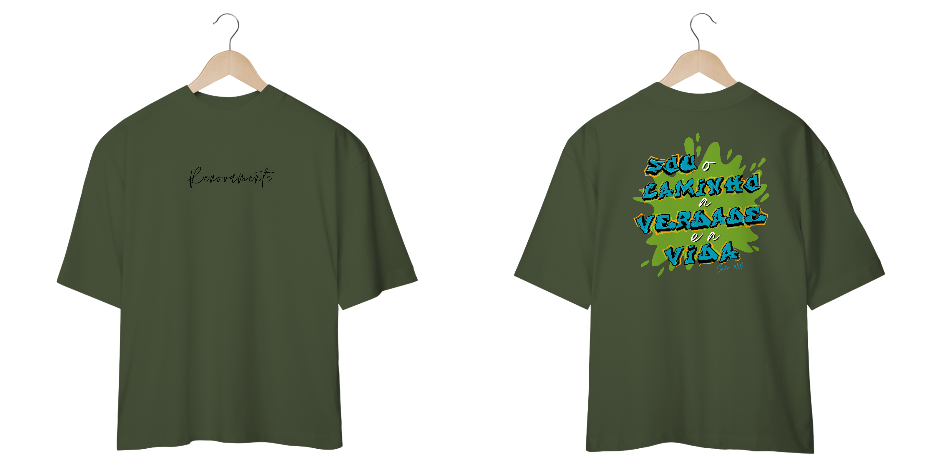 Jesus único caminho, modelagem mais ampla e larga do que as camisetas convencionais, proporcionando um caimento relaxado e confortável.